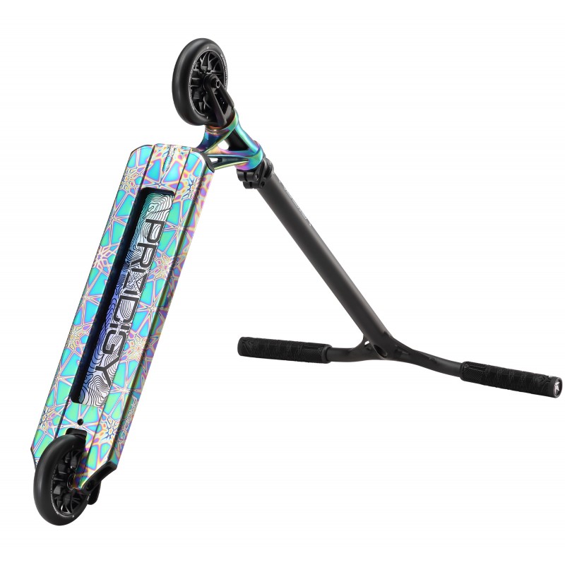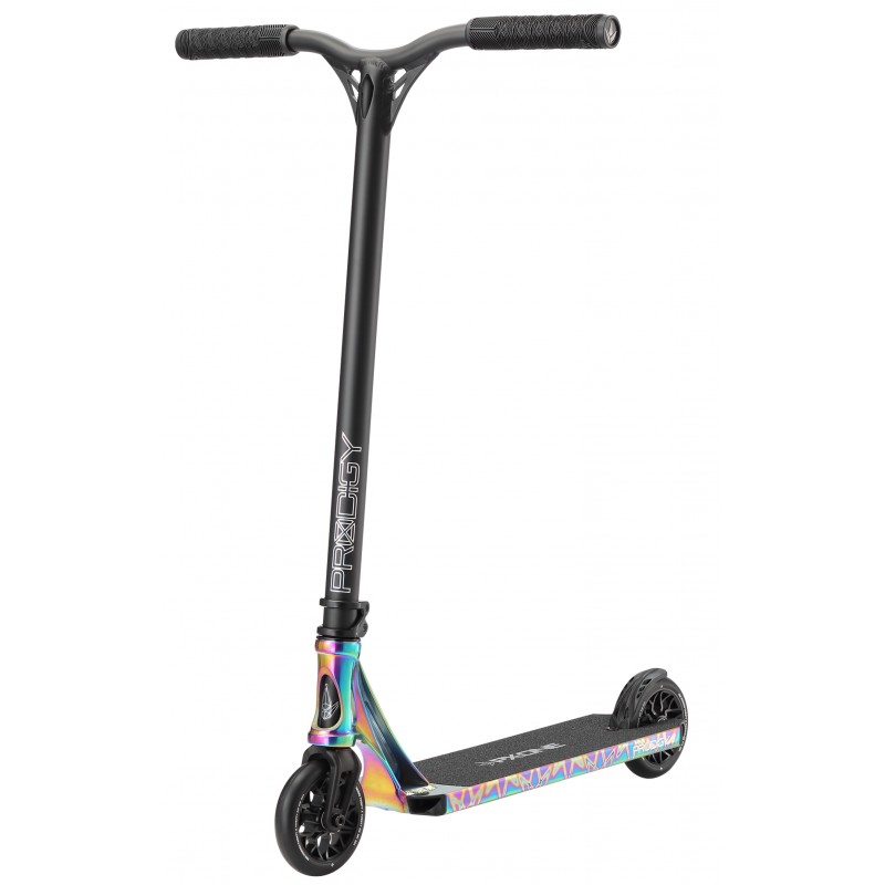 The Prodigy X ONE - PX ONE for short is the eleventh series in the PRODIGY line, built upon 10 generations and 14 years of professional- level complete scooters. The massive upgrades from PX continue including - Extech extrusion with its stealth lower profile, wider internal walls, boxier construction featuring a high responsive concave. The deck is still with its wider dimensions 5” W x 19.5” L The PX Headtube has been refined maintaining its increased contact with the deck with a now added durable anchoring weld to ensure this deck can take anything you throw at it. , Grip tape with increased grit count, Durable nylon deck plugs and V2 Nylon brake system, IHC LOW stack headset compression cap with pro level bearings to keep you spinning with all of it rolling on the SECTOR 120mm x 26mm PU wheels 86A.