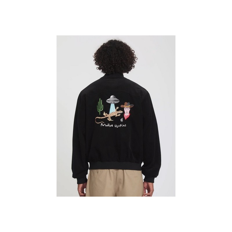 Features: ● Men's mid-weight corduroy jacket ● Western-inspired varsity jacket ● Relaxed fit ● Waist length ● Embroidery on the chest and back ● Snap button closure at the front ● Ribbed cuffs and hem ● Waist pockets ● Interior pocket ● Featured Artist Mickey Mason illustration ● 100% polyester printed taffeta lining ● Length for size M (from shoulder to hem): 29" (69 cm) Composition: 100% Cotton