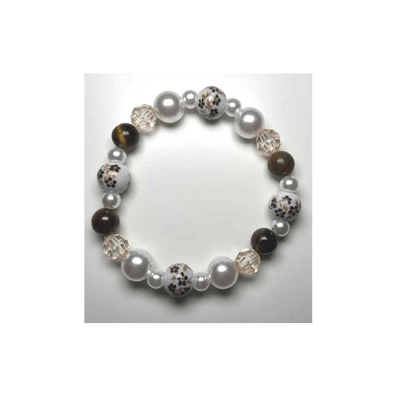 Composition: Natural tiger's eye beads, brown ceramic beads, clear acrylic beads, white artificial beads
