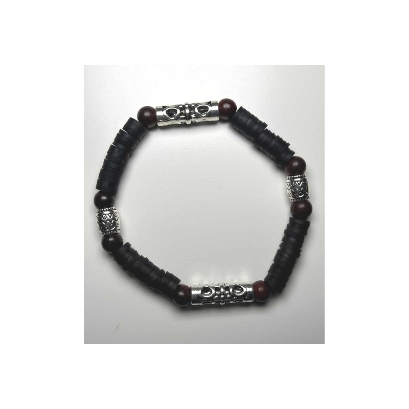 Composition: Black polymer flat beads, wooden beads, metal tubular beads
