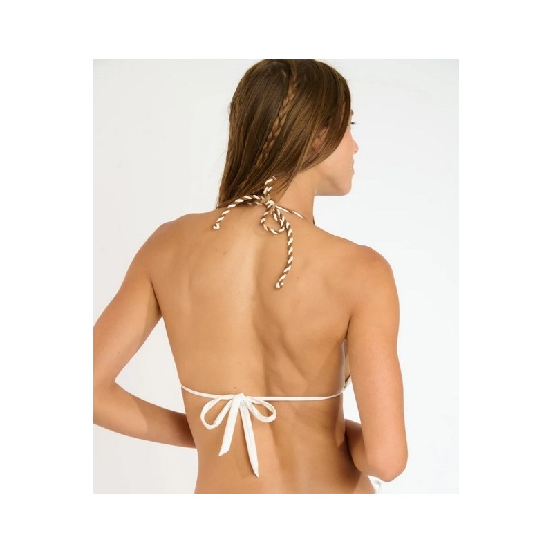 • Bikini top • Braided ties • Removable cups • Tribal print The CRICO MUSTANG ecru bikini top is from the new Banana Moon summer collection. Embrace a bohemian look with this top featuring tribal prints inspired by Native American plains. Its adjustable braided ties and removable cups allow it to adapt to your figure for a trendy look this season. Pair it with the MASSA MUSTANG bikini bottom for a complete look. Main fabric: 73% Polyamide, 27% Elastane • Lining: 83% Polyamide, 17% Elastane To care for your favorite bikini, we recommend: Using a towel to sit on: avoid contact with concrete, wood, or stones (poolside). The fibers used to make this swimsuit are soft and comfortable against the skin, but they can be damaged by contact with such surfaces. Rinse your swimsuit after each use: we recommend rinsing your swimsuit thoroughly with clean water after each use. Do not machine wash your swimsuit: we recommend hand washing without detergent or other abrasive products such as stain removers. Use a detergent for delicate fabrics or a simple soap. Never leave your swimsuit damp in its pouch: the prints may transfer if the swimsuit remains rolled or folded while still wet. Embroideries or special materials (beads, shells, crystals, etc.): avoid rubbing, twisting, or excessively stretching the fabric to which they are attached.
