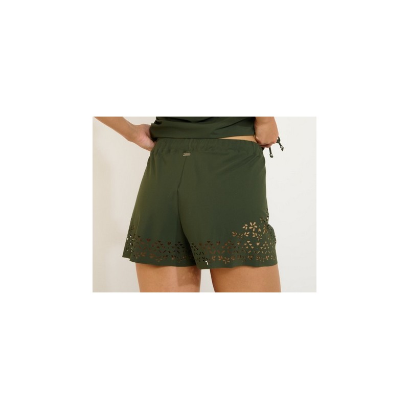 • Women's beach shorts in lycra • Khaki color • Laser-cut openwork design • Tie waist • Our model is 1.75 m tall and wears a size 36/S This summer, we love these beach shorts with their openwork design. This detail adds a chic and sophisticated touch. They're perfect with a swimsuit. The waist is adjustable with a tie to fit all body types. Composition: 75% Polyamide, 25% Elastane • Machine wash at 30°C maximum • Iron on a delicate setting • Do not tumble dry • Do not bleach • Do not dry crumpled or folded