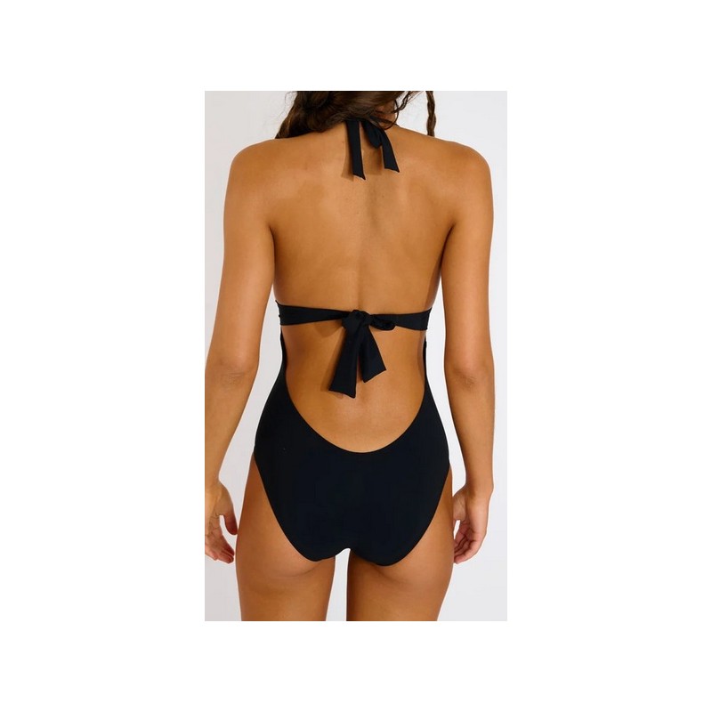 • One-piece swimsuit • Ties at the back and around the neck • Removable cups • High-cut design • Central ring with decorative embellishment KALIMA BLACK one-piece swimsuit. Fall for this black one-piece swimsuit with its flattering neckline, designed to enhance all figures. The embellishment placed between the breasts adds a chic and sophisticated touch, ideal for an elegant look on the beach or by the pool. Its best feature? Wear it as a bodysuit with jeans or shorts! To care for your favorite swimsuit, we recommend: Using a towel to sit on: avoid contact with concrete, wood, or stones (poolside). The fibers used in the making of this swimsuit are soft and comfortable against the skin but can be damaged by contact with such surfaces. Rinse your swimsuit after each use: we recommend rinsing your swimsuit thoroughly with clean water after each use. Do not machine wash your swimsuit: we recommend hand washing without detergent or other abrasive products such as stain removers. Use a detergent for delicate fabrics or a simple soap. Never leave your swimsuit damp in its pouch: prints may transfer if the swimsuit remains rolled or folded while still wet. For embellishments or special materials (beads, shells, crystals, etc.): avoid rubbing, twisting, or excessively stretching the fabric to which they are attached.