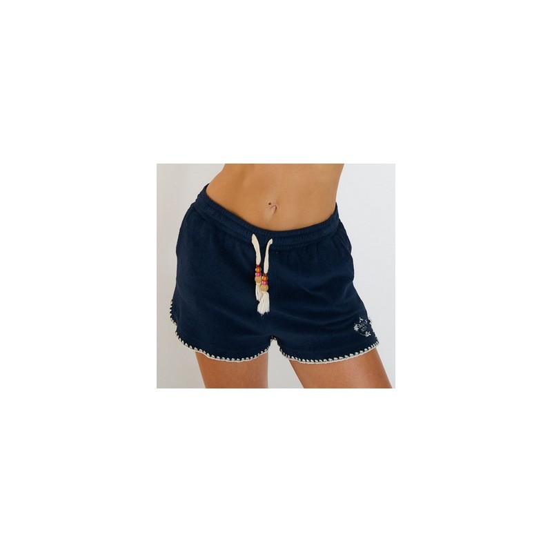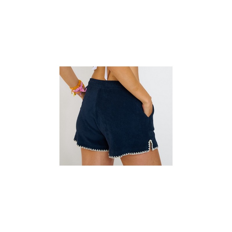 • Women's shorts • Terry cloth • Elastic waistband • Contrasting topstitching • Side pockets Women's shorts in navy blue Riley Palmsponge terry cloth. Comfortable and elegant, ideal for a sporty-chic bohemian look. Their impeccable cut, contrasting topstitching, and drawstrings adorned with beads and tassels add a unique and ultra-trendy touch, perfect for stylishly elevating your summer outfits. Main fabric: 100% Cotton • Machine wash at 30°C maximum • Iron on a delicate setting • Do not tumble dry • Do not bleach • Do not dry crumpled or folded
