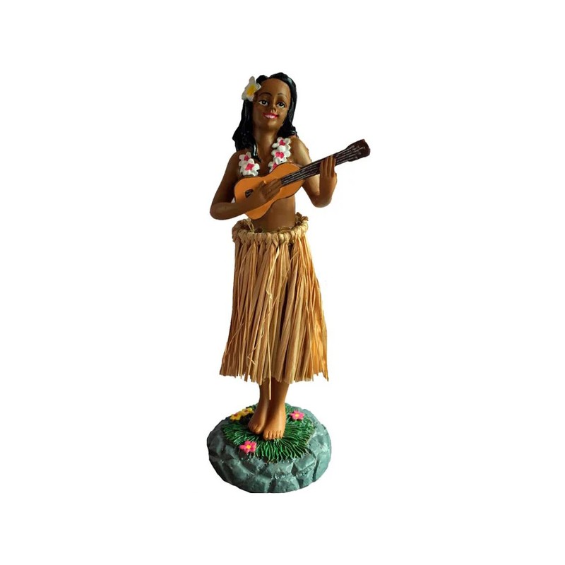 La figure a été sculptée à la main puis façonnée dans un moule en polyrésine et peinte à la main pour une belle finition. Elle porte une jupe hula naturelle , un beau collier lei hawaïen autour du cou et tient un ukulélé.